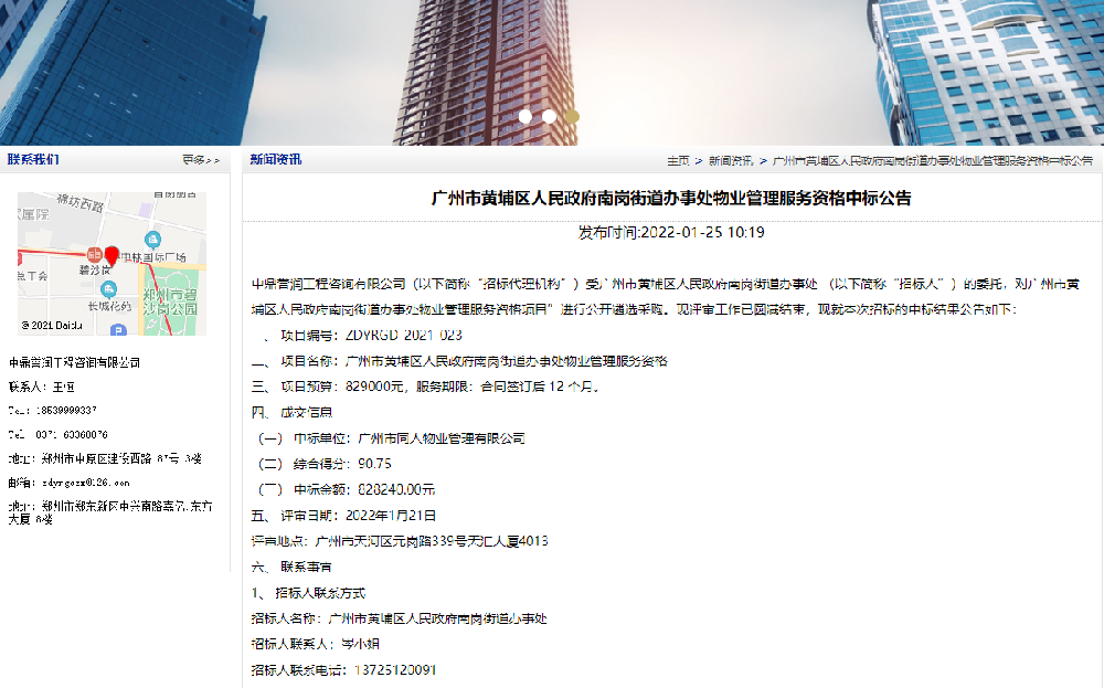 鼎點娛樂工程咨詢有限公司(以下簡稱“招標代理機構”)受廣州市黃埔區人民政府南崗街道辦事處 (以下簡稱“招標人”)的委托,對廣州市黃埔區人民政府南崗街道辦事處物業管理服務資格項目”進行公開遴選采購。現評審工作已圓滿結束,現就本次招標的中標結果公告如下:一、項目編號:ZDYRGD-2021-023二、項目名[詳細]